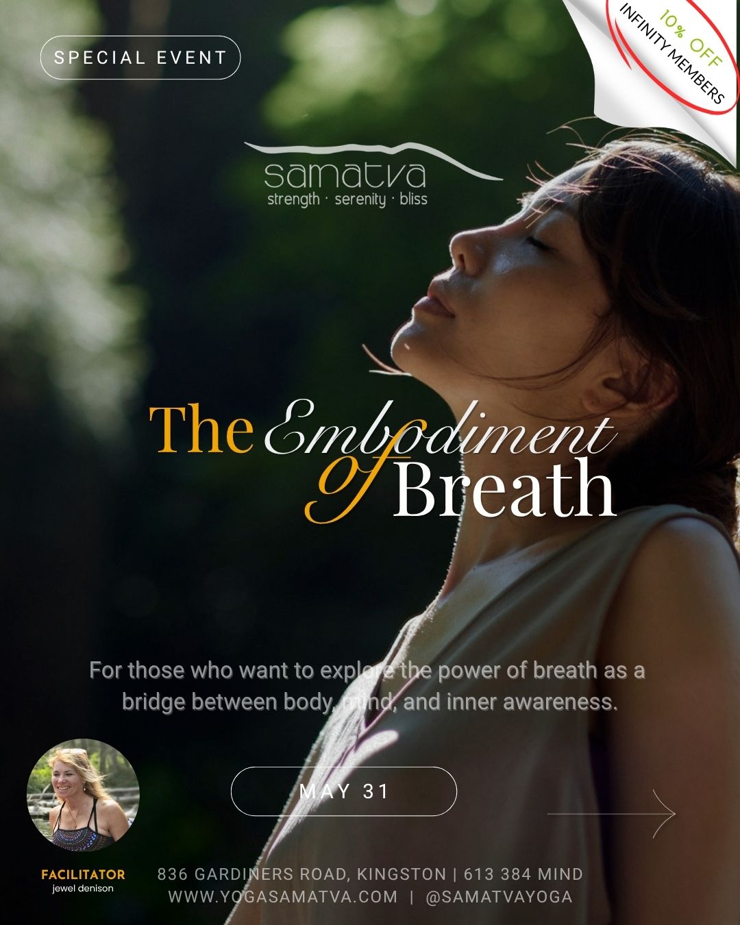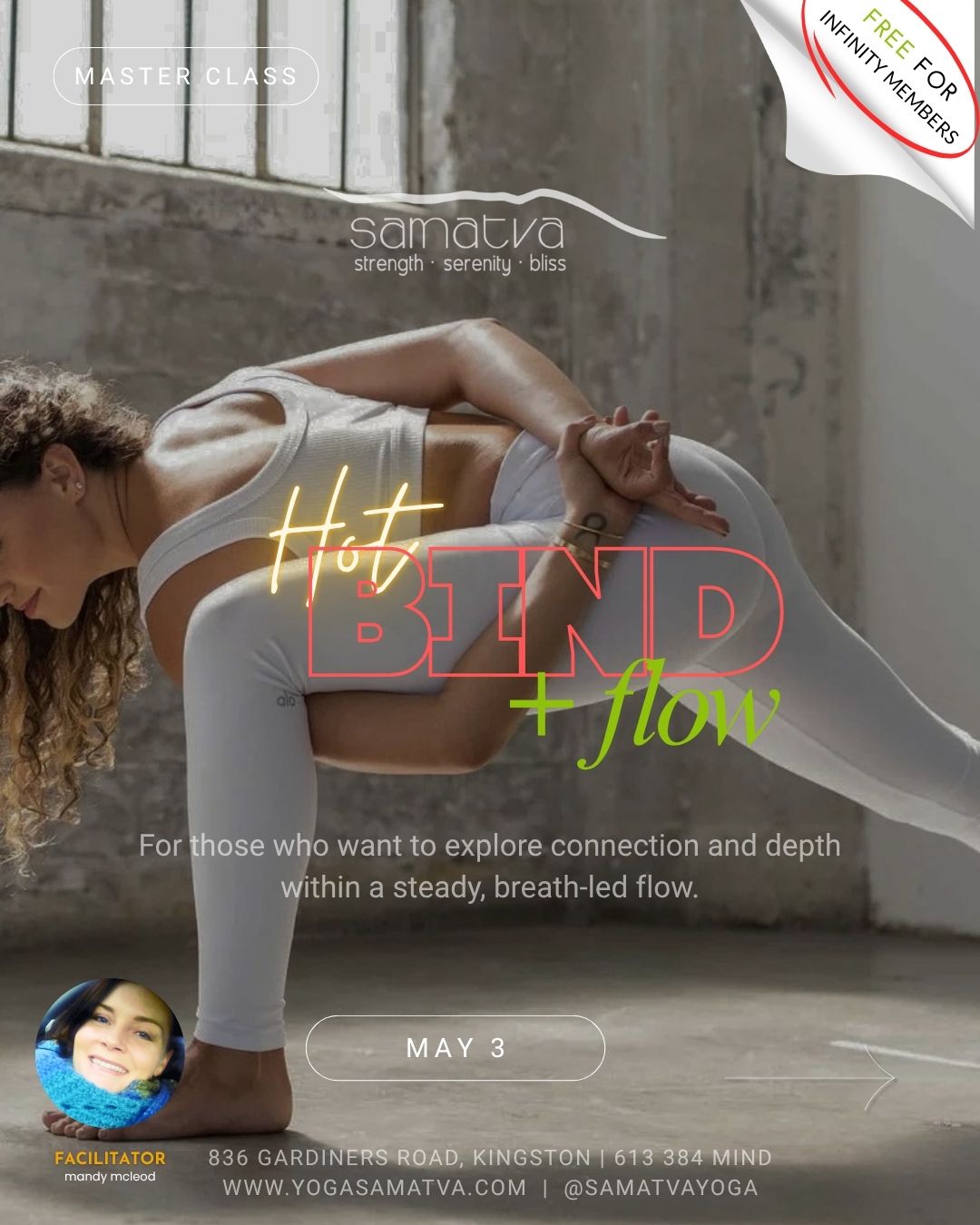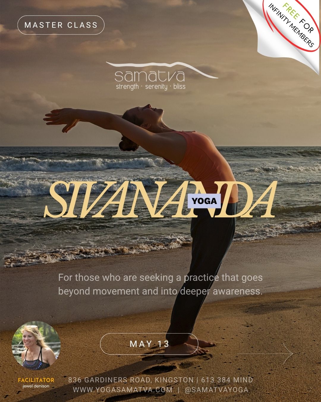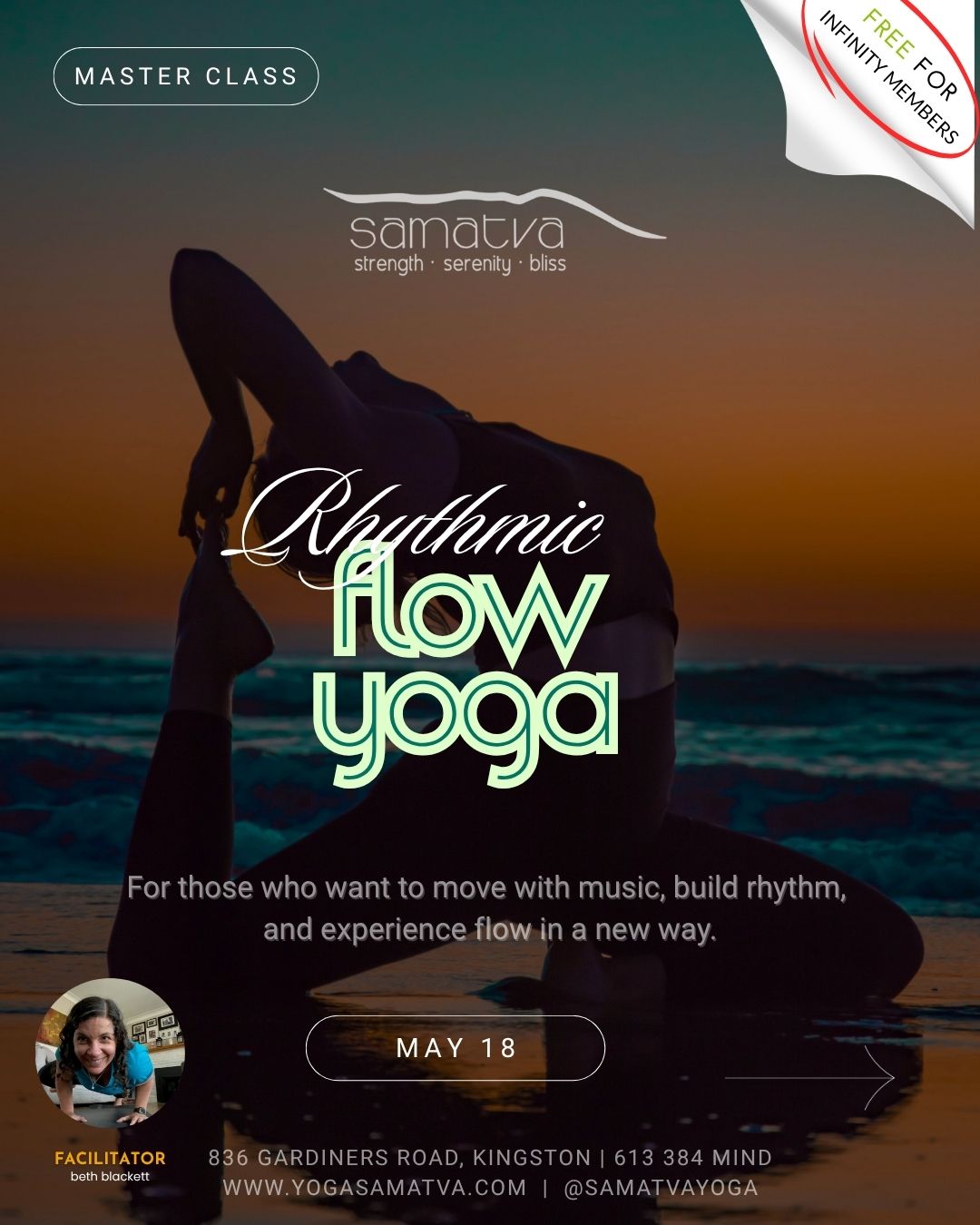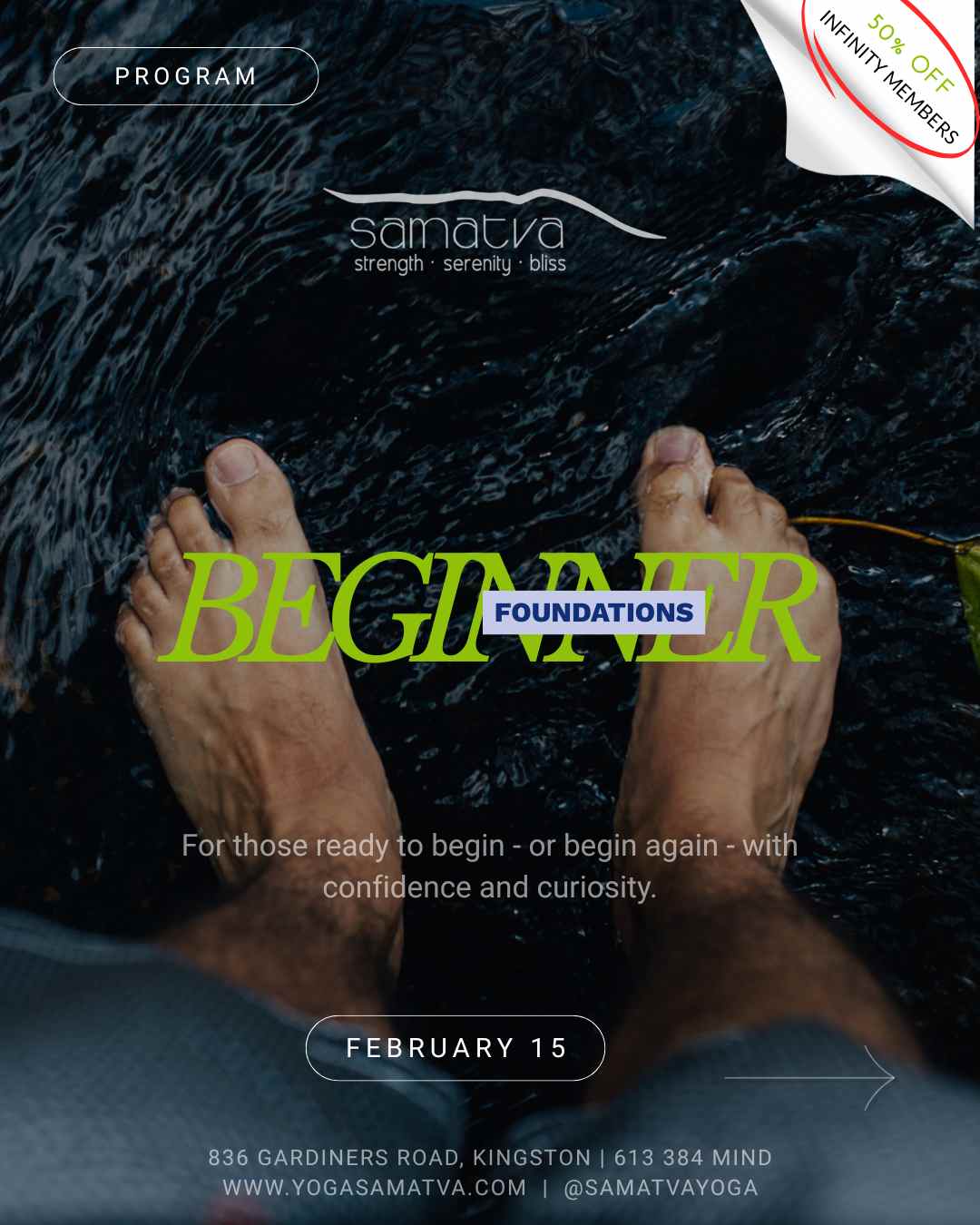 All event + program cancellations must be completed 48 hours before the start of any event and a credit will be applied to your studio account. All purchases are non-refundable unless Samatva Yoga has cancelled. No Show fees do not apply to event + programming reservations. Infinity Members attending Master Classes + EssentialYoga Workshop must cancel 48 hours before scheduled event or regular ticket cost will be charged without exception. All cancellations must be done via your Mindbody portal.